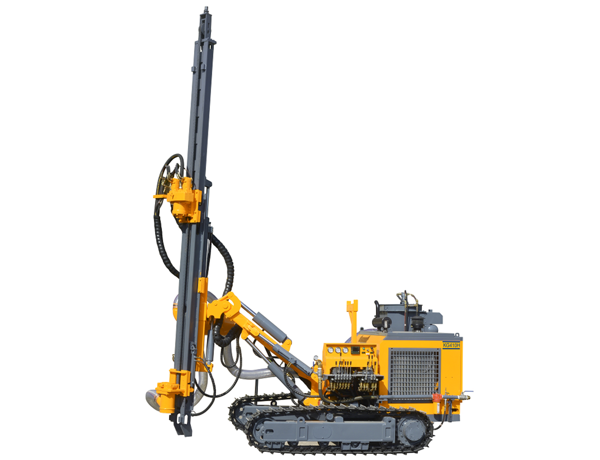 KG410/KG410H型露天潛孔鉆車是應(yīng)國(guó)家對(duì)環(huán)保要求而進(jìn)行升級(jí)的一款新設(shè)備。配備玉柴四缸國(guó)三發(fā)動(dòng)機(jī),滿足國(guó)家對(duì)排放和環(huán)保的要求。采用柱塞行走馬達(dá),折邊履帶架和工程四輪一帶,提高工作壓力,增加爬坡性能。增大俯仰和舉臂油缸,滿足極限位置使用要求。同時(shí)對(duì)液壓系統(tǒng)升級(jí),增大系統(tǒng)流量,提高回轉(zhuǎn)轉(zhuǎn)速。對(duì)加大提升油缸和鏈條,提高提升力和可靠性。加固導(dǎo)軌和增加滑板上下耐磨板,延長(zhǎng)使用壽命。導(dǎo)軌采用傾斜安裝,方便操作和觀察。罩殼采用加厚型材折邊,增加強(qiáng)度和剛性,增加起吊吊環(huán),方便裝卸吊裝。