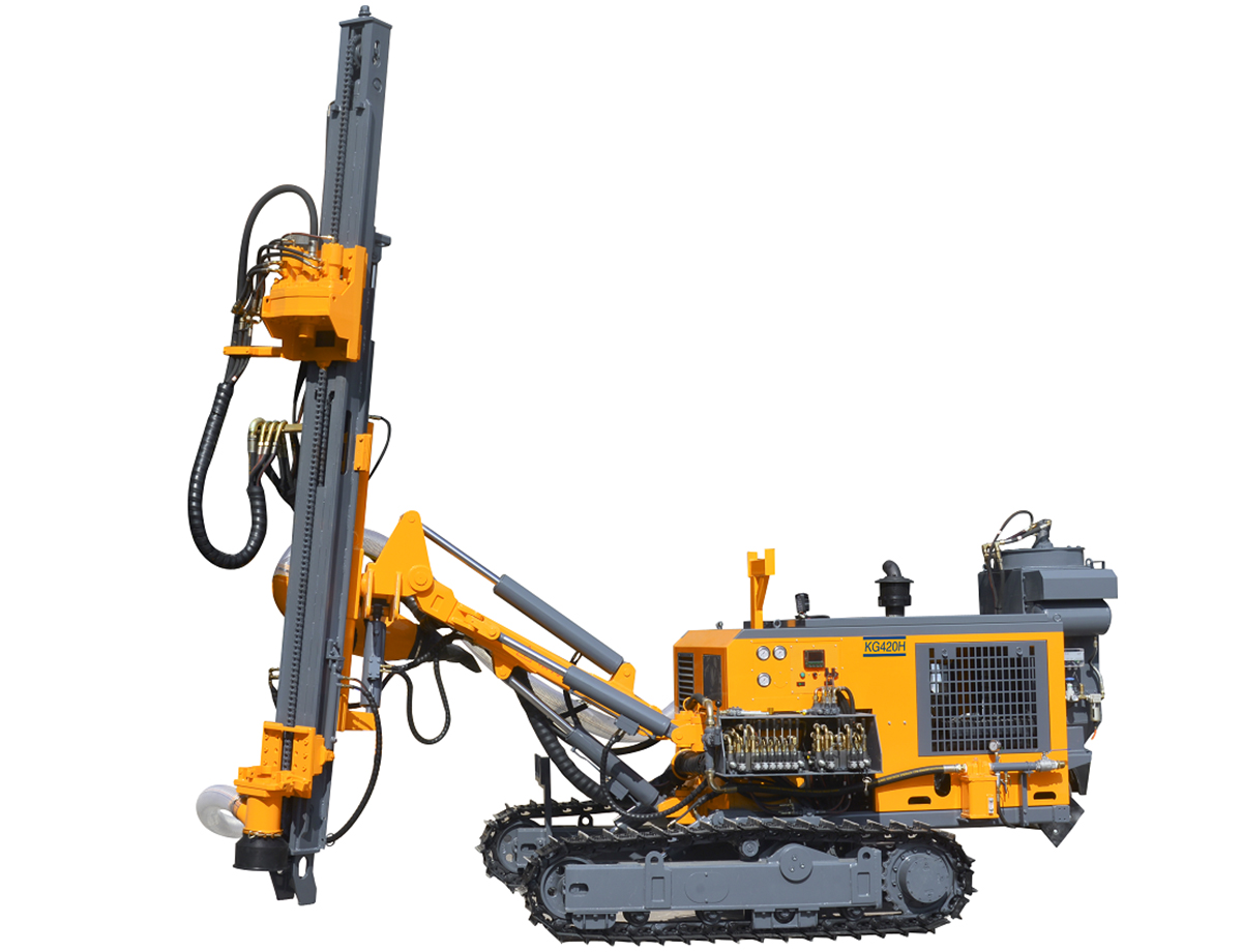 KG420/KG420H型露天潛孔鉆車是應國家對環(huán)保要求而進行升級的一款新設備。配備玉柴四缸國三發(fā)動機,滿足國家對排放和環(huán)保的要求。采用柱塞行走馬達,折邊履帶架和工程四輪一帶,提高工作壓力,增加爬坡性能。增大俯仰和舉臂油缸,滿足極限位置使用要求。同時對液壓系統(tǒng)升級,增大系統(tǒng)流量,提高回轉(zhuǎn)轉(zhuǎn)速。回轉(zhuǎn)器采用雙馬達減速器,增大回轉(zhuǎn)扭矩和轉(zhuǎn)速。對加大提升油缸和鏈條,提高提升力和可靠性。加固導軌和增加滑板上下耐磨板,延長使用壽命。導軌采用傾斜安裝,方便操作和觀察。罩殼采用加厚型材折邊,增加強度和剛性,增加起吊吊環(huán),方便裝卸吊裝。