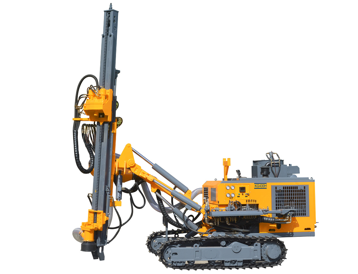 KG430S/KG430SH型露天潛孔鉆車(chē)是應(yīng)國(guó)家對(duì)環(huán)保要求而進(jìn)行升級(jí)的一款新設(shè)備。配備玉柴四缸國(guó)三發(fā)動(dòng)機(jī),滿(mǎn)足國(guó)家對(duì)排放和環(huán)保的要求。采用柱塞行走馬達(dá),折邊履帶架和工程四輪一帶,提高工作壓力,增加爬坡性能。增大俯仰和舉臂油缸,滿(mǎn)足極限位置使用要求。同時(shí)對(duì)液壓系統(tǒng)升級(jí),增大系統(tǒng)流量,提高回轉(zhuǎn)轉(zhuǎn)速。回轉(zhuǎn)器采用雙馬達(dá)減速器,增大回轉(zhuǎn)扭矩和轉(zhuǎn)速。對(duì)加大提升油缸和鏈條,提高提升力和可靠性。加固導(dǎo)軌和增加滑板上下耐磨板,延長(zhǎng)使用壽命。導(dǎo)軌采用傾斜安裝,方便操作和觀察。罩殼采用加厚型材折邊,增加強(qiáng)度和剛性,增加起吊吊環(huán),方便裝卸吊裝。