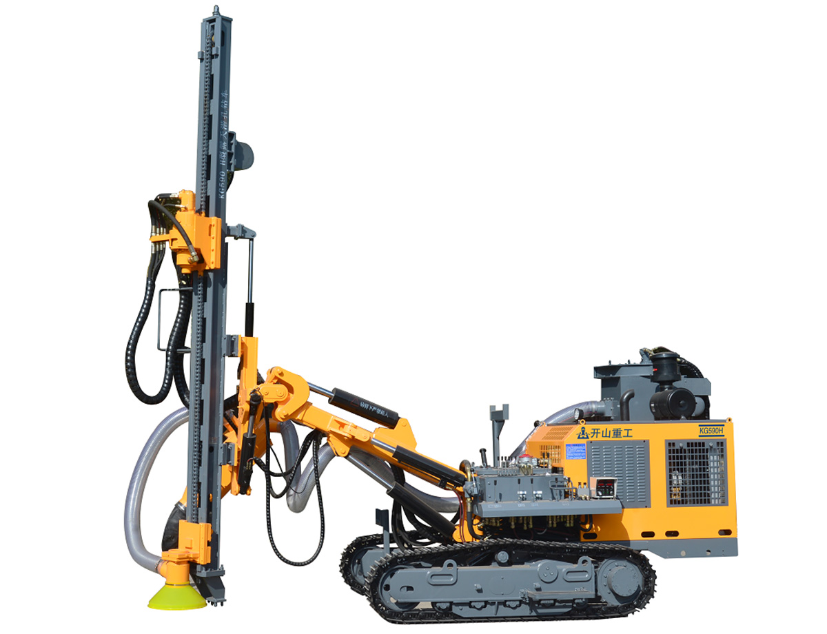 KG590/KG590H型露天潛孔鉆車是應(yīng)國家對環(huán)保要求而進(jìn)行升級的一款新設(shè)備。配備玉柴四缸國三發(fā)動機(jī),滿足國家對排放和環(huán)保的要求。采用柱塞行走馬達(dá),折邊履帶架和工程四輪一帶,提高工作壓力,增加爬坡性能。增大俯仰和舉臂油缸,滿足極限位置使用要求。同時(shí)對液壓系統(tǒng)升級,增大系統(tǒng)流量,提高回轉(zhuǎn)轉(zhuǎn)速?;剞D(zhuǎn)器采用大馬達(dá)減速器,增大回轉(zhuǎn)扭矩和轉(zhuǎn)速。對加大提升油缸和鏈條,提高提升力和可靠性。加固導(dǎo)軌和增加滑板上下耐磨板,延長使用壽命。導(dǎo)軌采用傾斜安裝,方便操作和觀察。罩殼采用加厚型材折邊,增加強(qiáng)度和剛性,增加起吊吊環(huán),方便裝卸吊裝。